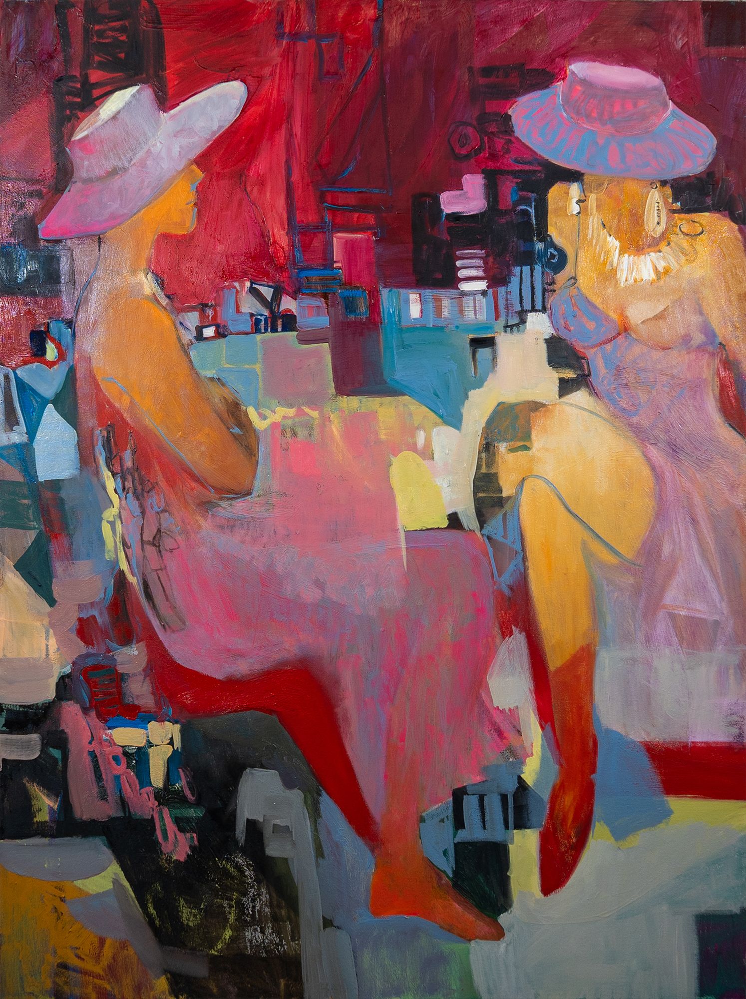 Two women share a quiet moment of connection, where color and form echo the intimacy of friendship, conversation, and unspoken understanding.