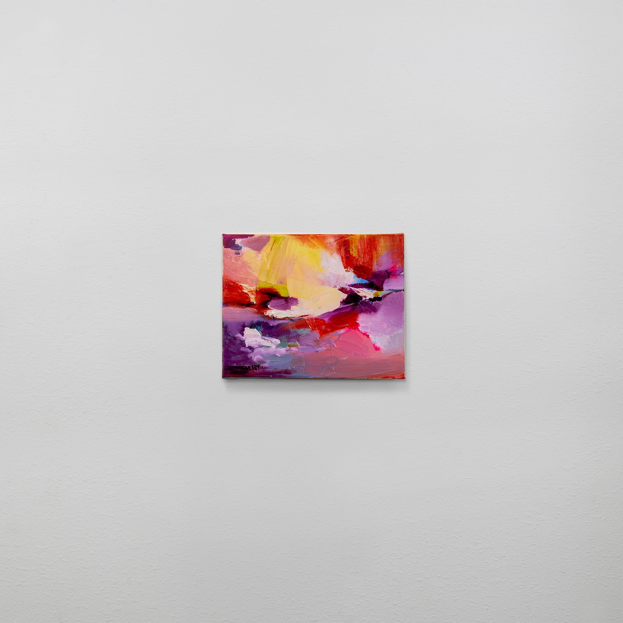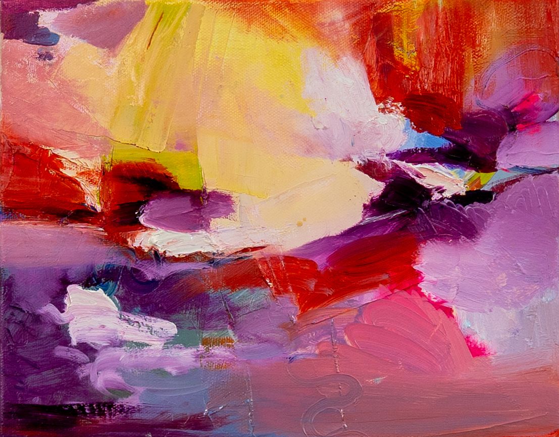 Vibrant abstract painting with yellow, red, pink, and purple brushstrokes on a grey wall.