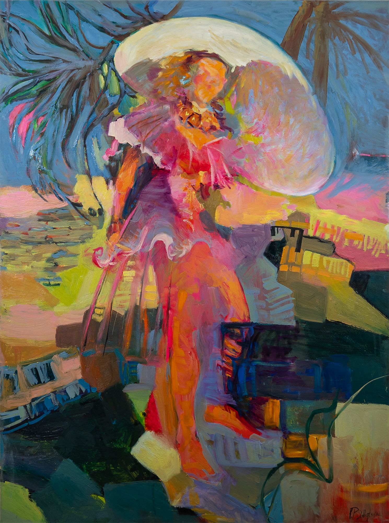 “Lady in a Hat” explores feminine elegance and quiet mystery. The wide-brimmed hat becomes a symbol of refinement, partially obscuring the figure and creating an intriguing sense of allure. Vibrant colors and fluid brushstrokes highlight her softness, strength, and expressive presence. The painting invites viewers into a subtle dialogue about beauty, individuality, and the many layers of the feminine spirit.